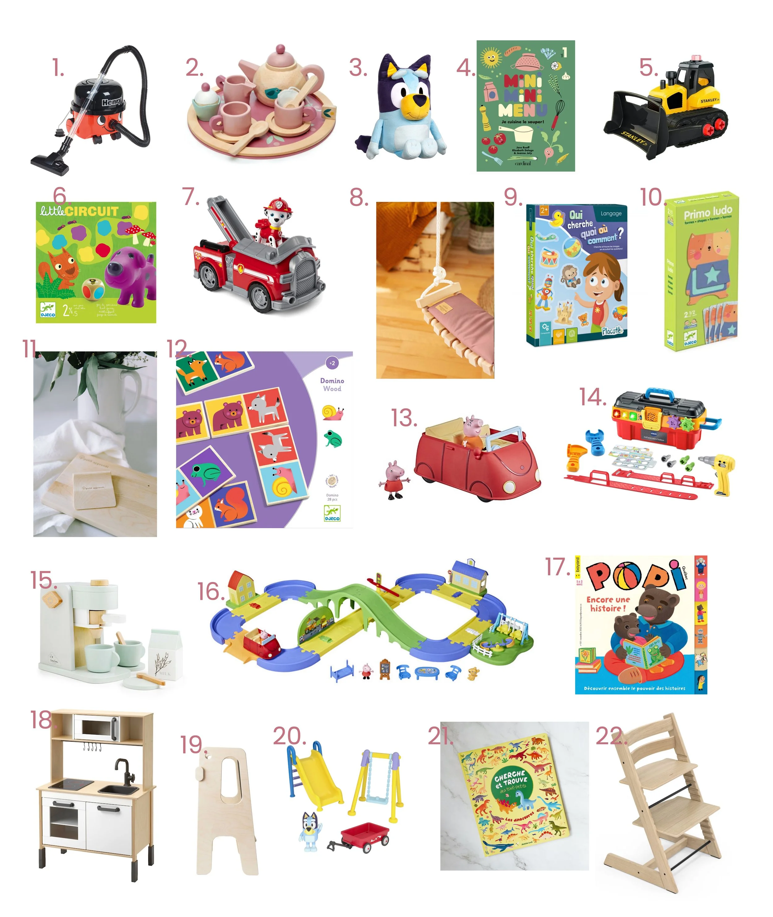 Ma fille aura 2 ans dans quelques jours, alors ces idées reflètent ces plus récentes préférences en matière de jeux. En ce moment, elle aime tout faire comme nous, observer comment les choses fonctionnement et jouer avec des bonhommes / toutous / poupées. Je suis aussi très excitée de lui offrir ces premiers jeux de société. Sinon, c’est aussi une belle occasion de lui offrir des trucs plus pratiques comme en #11, #19 et #22.