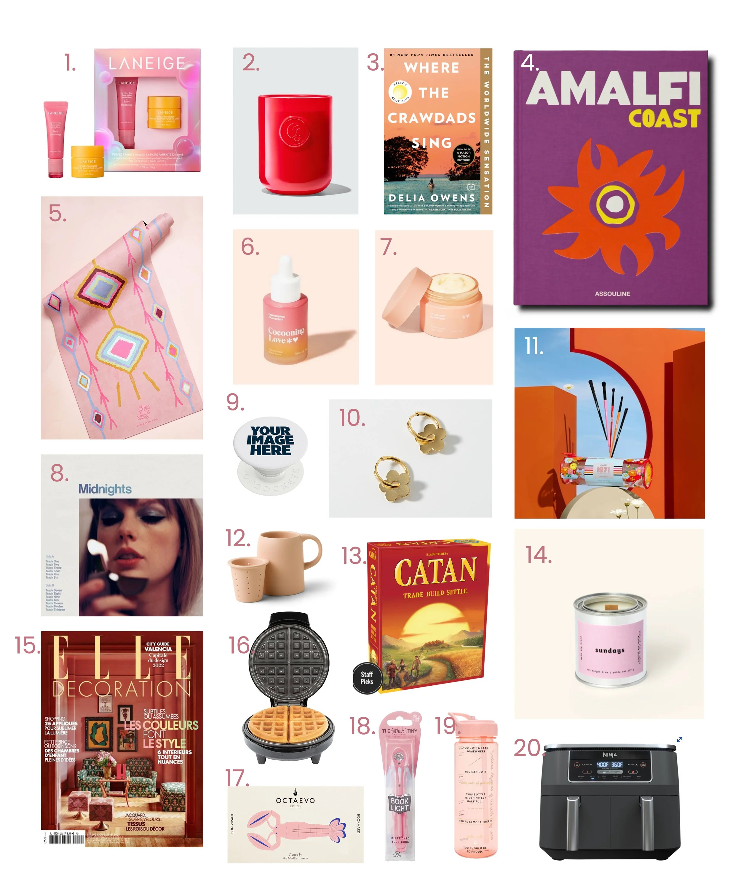 Cette liste comprend mes trucs préférés que j’utilise déjà au quotidien et des objets coup de cœur qui se retrouvent sur ma wishlist. Pour mon mari qui regardera attentivement cette liste cadeau : j’ai un gros crush sur le signet en #17 et la lumière de lecture en #18.